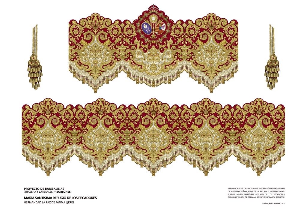 Así, el escudo de la “Hermandad de la Paz de Fátima”, centra la bambalina frontal bajo una tupida red de roleos que se intercalan con la malla. En la trasera, podremos ver el escudo de la sevillana Hermandad de San Bernardo por su madrinazgo y vínculo tan especial que tienen con la Hermandad jerezana. Las bambalinas interiores contienen letanías lauretanas en latín; “Regina Pacis”, en la delantera, y, en la trasera, “Refugium Peccatorum”.
