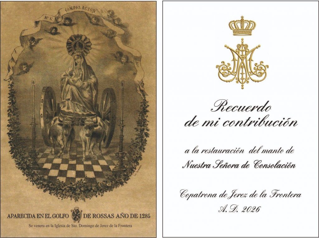 Nuestra Señora de Consolación, Copatrona de Jerez, requiere de la ayuda de sus fieles para la recuperación de su patrimonio. Se ha puesto en marcha una iniciativa abierta a todos los jerezanos con el objetivo de restaurar su manto procesional, una pieza que atesora siglos de devoción e historia en nuestra ciudad.