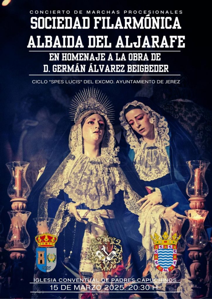 El concierto será interpretado por la Sociedad Filarmónica Albaida del Aljarafe y tendrá lugar el próximo sábado 15 de marzo a las 20:30 horas en el histórico Convento de los Padres Menores Capuchinos de Jerez de la Frontera. Con este evento, la Hermandad rinde tributo a la figura de D. Germán Álvarez Beigbeder, cuyo legado sigue vivo en la música procesional y en nuestras tradiciones religiosas.