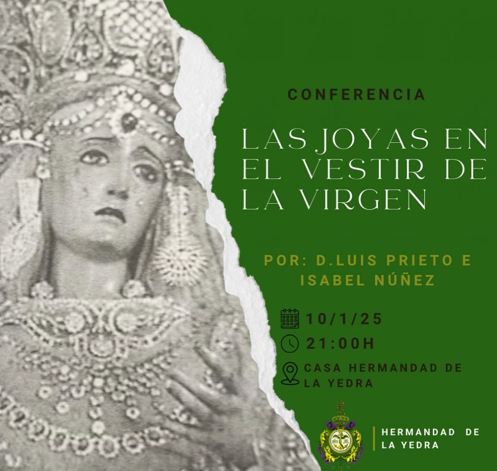 Hoy, 10 de enero a las 21:00 horas, la Hermandad de la Yedra va a celebrar una conferencia titulada «Las joyas en el vestir de la Virgen», a cargo de Luis Prieto e Isabel Núñez.