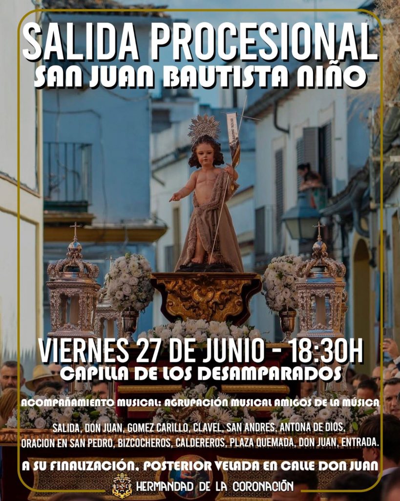 La Hermandad de la Coronación de Espinas celebra este viernes 27 de junio, a partir de las 18:30 horas, la salida procesional de San Juan Bautista Niño desde la Capilla de los Desamparados.