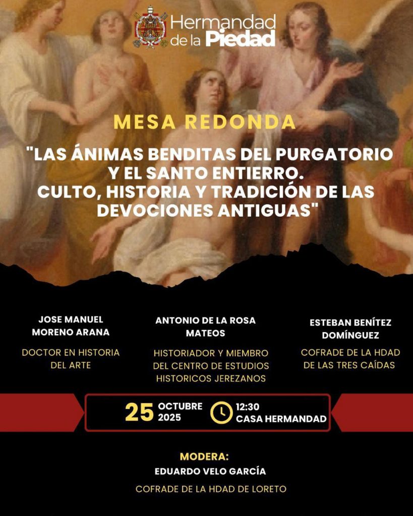 La Hermandad de la Piedad ha organizado una interesante Mesa Redonda titulada “Las Ánimas Benditas del Purgatorio y el Santo Entierro. Culto, historia y tradición de las devociones antiguas”, que tendrá lugar el sábado 25 de octubre a las 12:30 horas en la Casa de Hermandad.