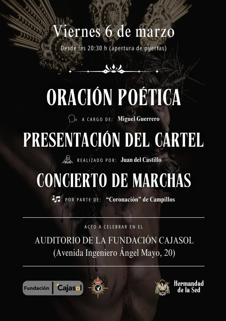 La Hermandad de la Sed continúa desgranando su intensa agenda de actos para esta Cuaresma. El próximo viernes 6 de marzo, el Auditorio de la Fundación Cajasol (Avenida Ingeniero Ángel Mayo, 20) será la sede de una de las citas más esperadas por los hermanos de la corporación: la presentación del Cartel Lunes Santo 2026 y la Oración Poética.