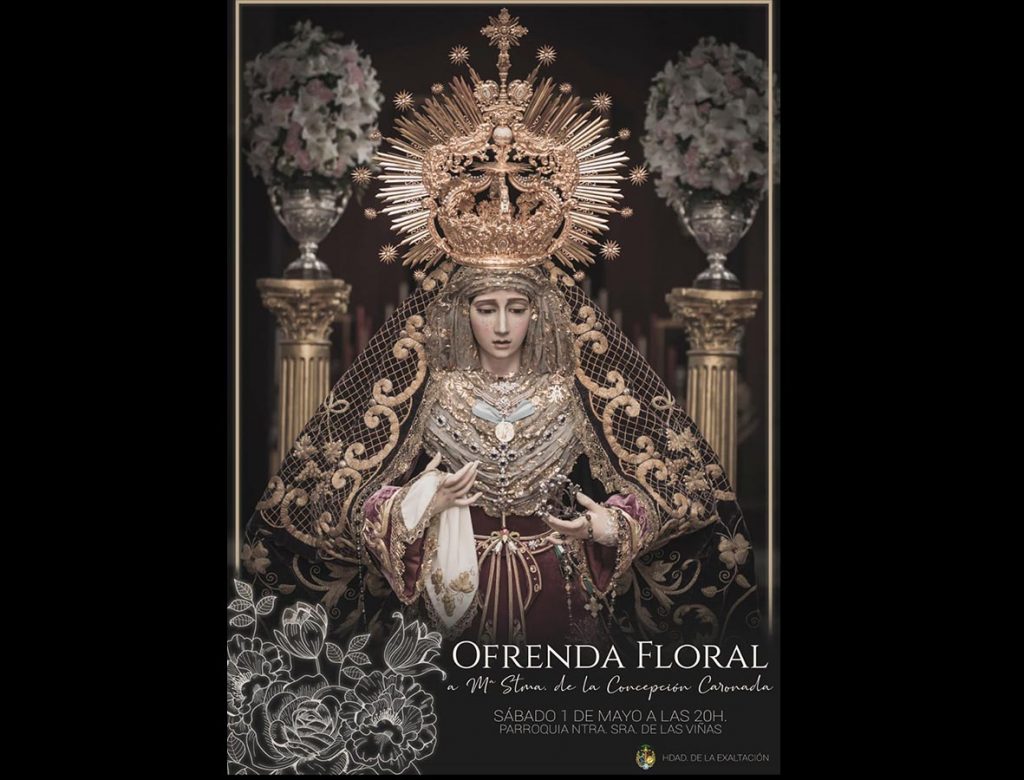 El próximo sábado 1 de mayo, a las 20.00 horas, tendrá lugar en la Parroquia de Nuestra Señora de las Viñas, la Ofrenda Floral a María Santísima de la Concepción Coronada. Desde la Hermandad animan a los hermanos y devotos que se acerquen para llenar la Parroquia de flores.