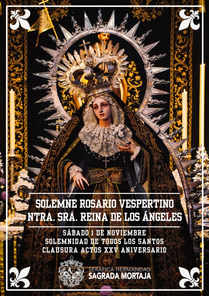 Como broche final a estos cultos y dentro de los actos conmemorativos del XXV Aniversario Fundacional como Asociación Pública de Fieles, la Hermandad celebrará un Rosario Vespertino Extraordinario presidido por la bendita imagen de Nuestra Señora Reina de los Ángeles el próximo sábado 1 de noviembre, coincidiendo con la Solemnidad de Todos los Santos.