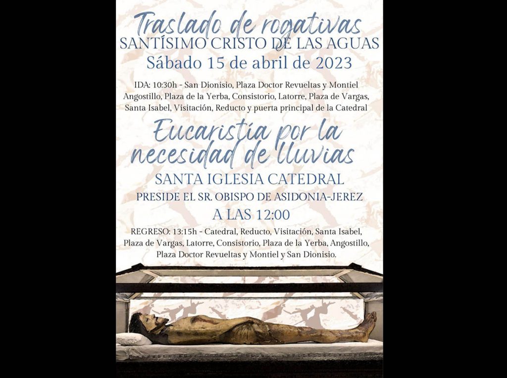 El próximo sábado 15 de abril a las 10.30 horas tendrá lugar el traslado de rogativas del Santísimo Cristo de las Aguas desde San Dionisio a la Santa Iglesía Catedral, donde se celebrará Eucaristía por la necesidad de lluvias.