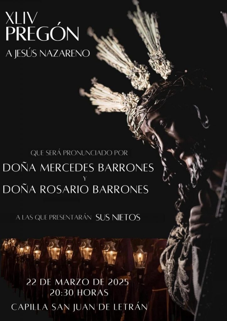 Este año, el pregón estará a cargo de Mercedes Barrones y Rosario Barrones, hermanas de la hermandad, quienes compartirán su profunda vinculación con el Nazareno en un emotivo pregón. En un gesto cargado de simbolismo, ambas serán presentadas por sus propios nietos, añadiendo un toque especial al acto.